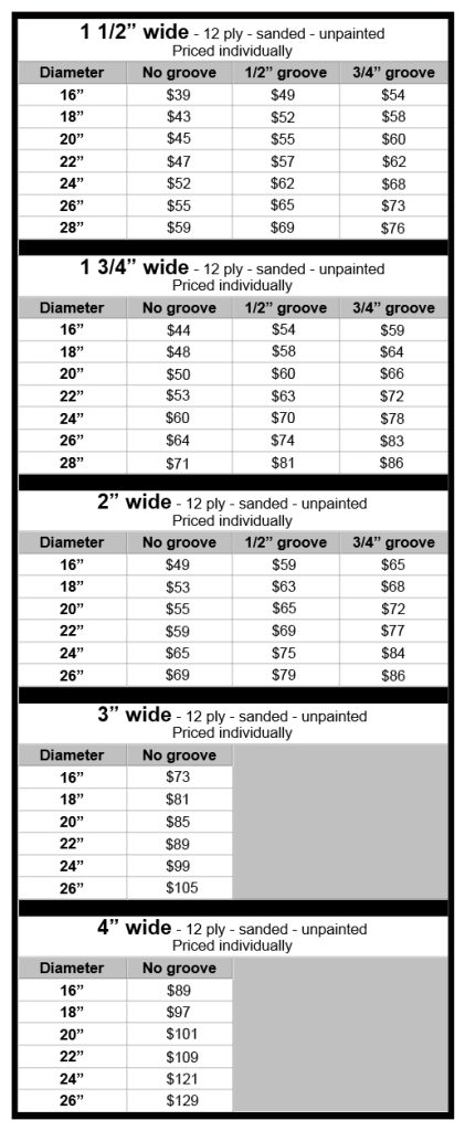 We offer a wide variety of Maple drum hoops for bass drums, toms, and snare drums. Below we list the most common widths, but we can make hoops any width upon request. Bass drum hoops are cut from Keller hoop stock tubes, and all tom and snare wood hoops and rims are made by Precision Drum Company in house using Keller Maple stock. As a result, our hoops are high quality and extremely durable.